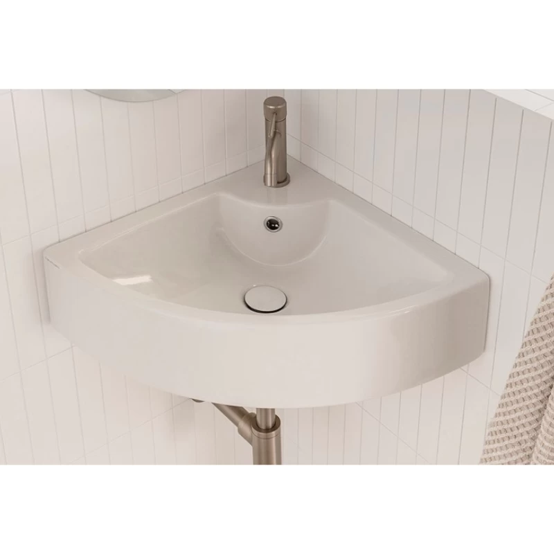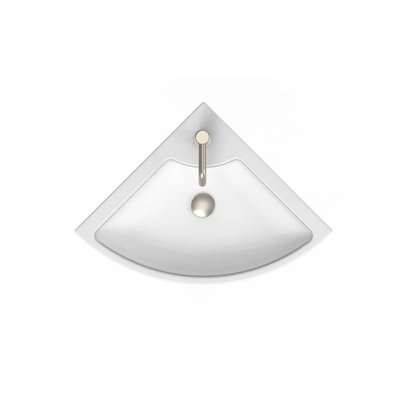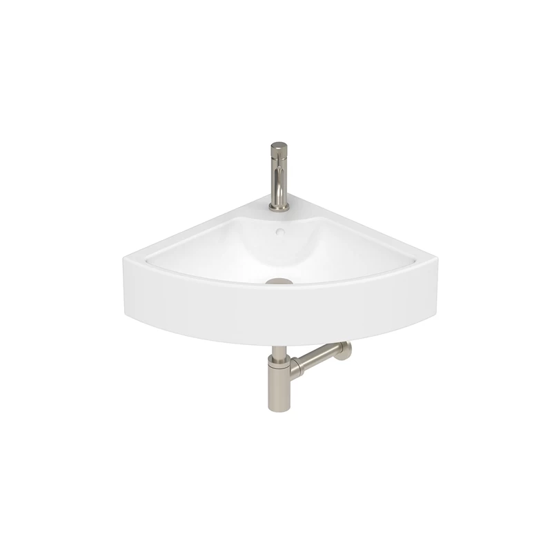 Its corner solution, wall-hung basin design makes it a versatile choice for various bathroom aesthetics.