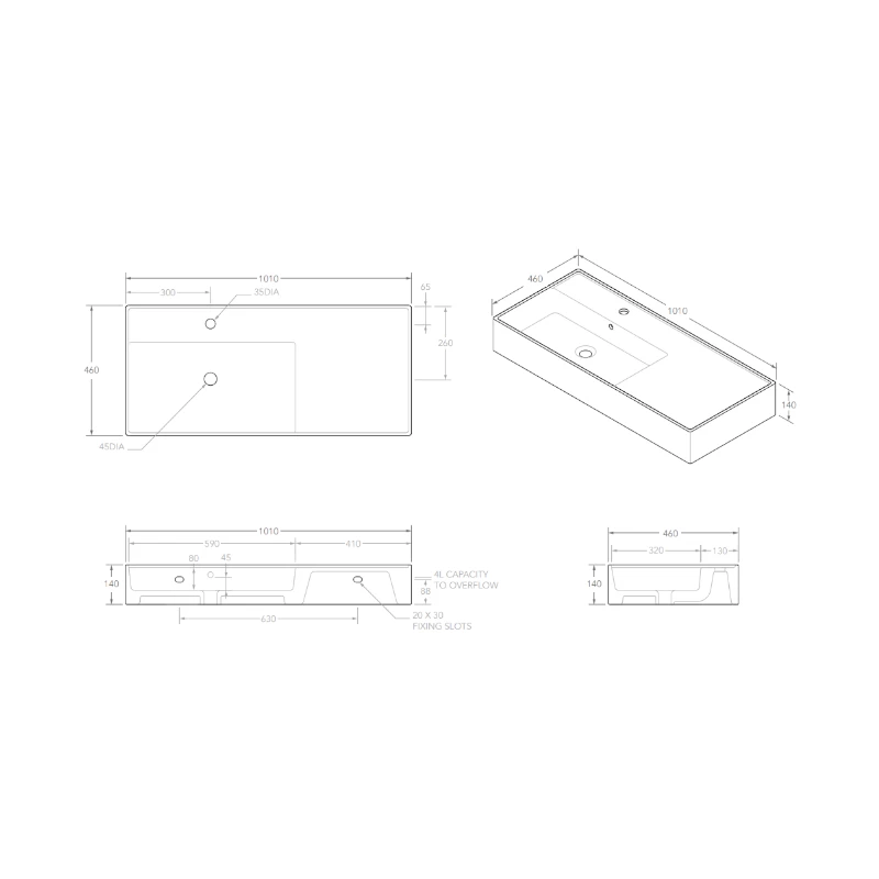 This ceramic fixture, measuring 1010mm wide x 140mm high x 460mm deep, offers a generous 5L capacity while maintaining a sleek profile.