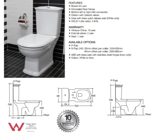WELS 4 Star rated, 4.5L/3L (3.4L average flush)
