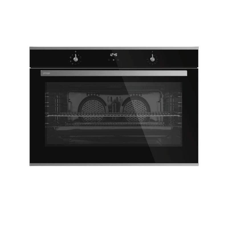 Omega 90cm 9 function oven, double glazed door with stainless steel & black glass finish