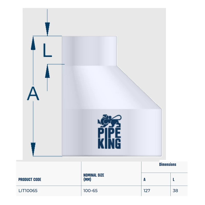 View Pipe King Level Invert Taper 100 x 65mm DWV LIT10065 specs at Pipe King Website