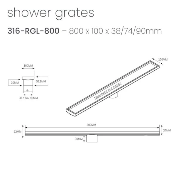 Measuring 100x800mm with a 90mm outlet, it’s designed for seamless integration with your chosen tiles, enhancing the bathroom’s design continuity.
