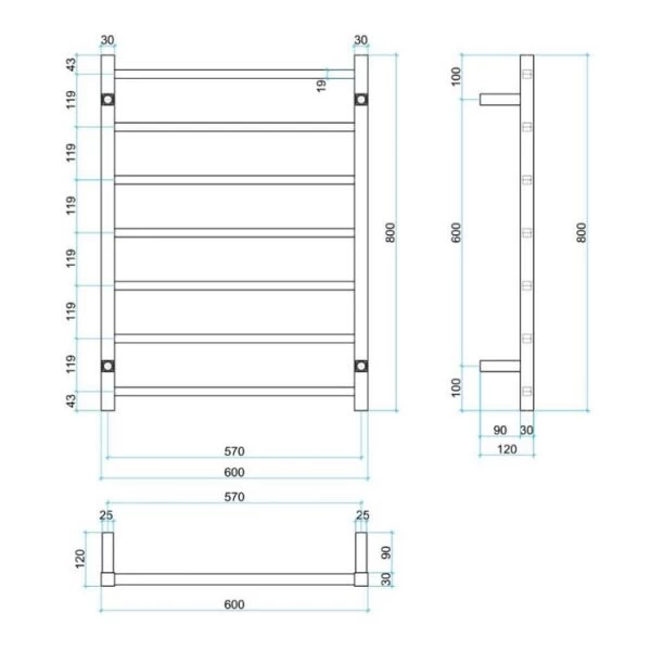 The SS4412 Heated Towel Rail is a 600×800 7 bar polished stainless steel ladder rail.