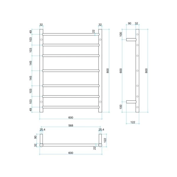The SRB4412 Heated Towel Rail is a 600×800 7 bar brushed stainless steel ladder rail.